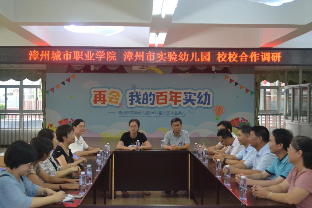 2021年7月2日下午,漳州城市职业学院党委书记洪亚勇,副书记、院长刘惠河,副书记朱镇生,副院长郑文平等学院领导带队走访了学前教育系校外实训基地漳州市实验幼儿园。