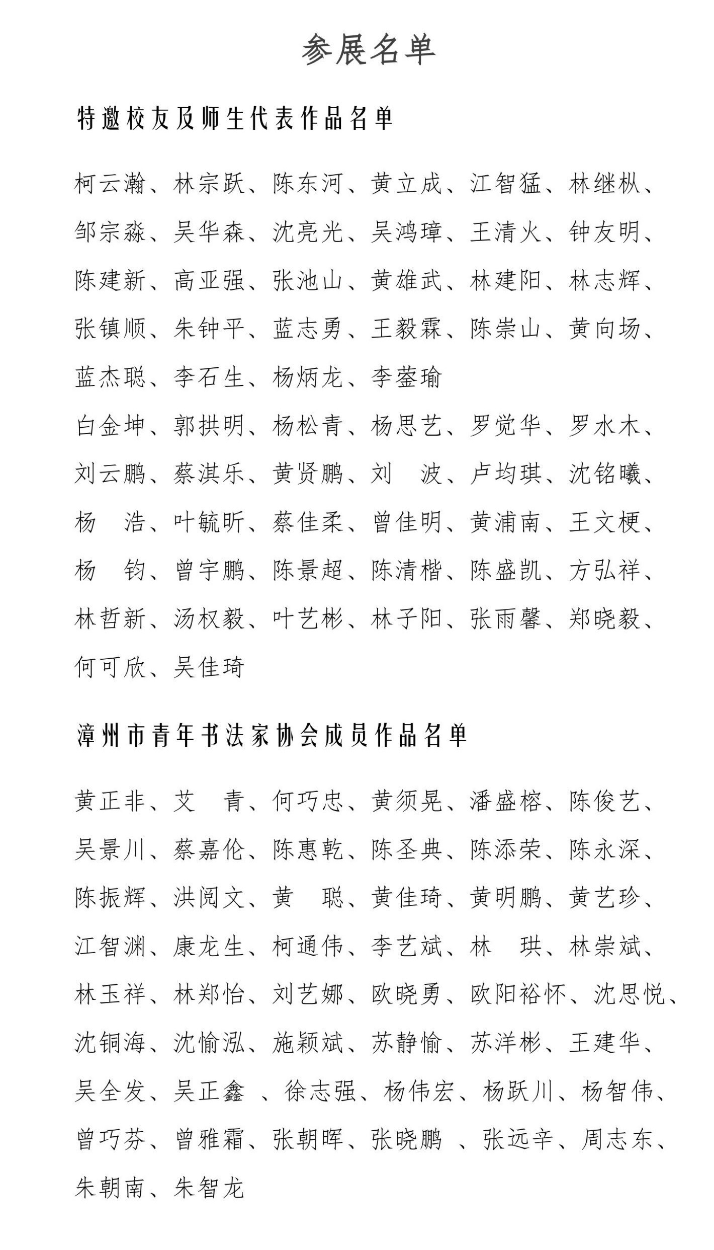 本次展览共向学院在校师生、校友,向漳州青书协会员征集到110件作品,其中有近50件为中国书法家协会会员作品,参展作品或灵动秀美、或遒劲厚重、或端庄内敛、或大气磅礴,具有很高的艺术造诣,作者们用酣笔饱墨尽情书写爱党爱国情怀,给我们提供了一场文化盛宴、艺术大餐。