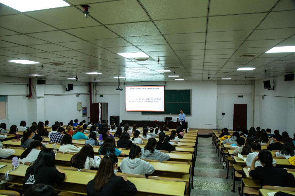 2021年4月28日,学院党委书记洪亚勇在怀仁楼梯教三作党史学习教育宣讲,各系教师党员、学生党员、发展对象、入党积极分子130多人参加学习。