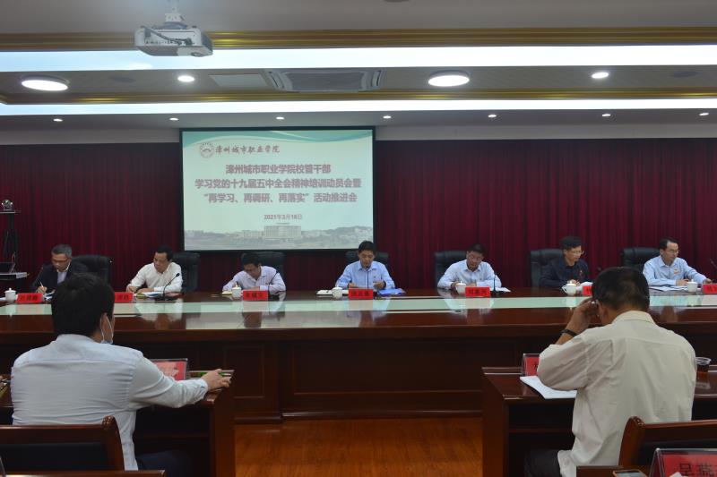2021年3月16日,漳州城市职业学院召开校管干部学习党的十九届五中全会精神培训动员会暨学院“再学习、再调研、再落实”活动推进会,传达学习省委书记尹力同志在省管干部学习贯彻党的十九届五中全会精神研讨班开班式暨省委开展“再学习、再调研、再落实”活动动员会上的讲话精神,对学院开展“再学习、再调研、再落实”活动进行再动员、再推进。推进会由党委副书记、院长刘惠河主持。学院党委班子成员、各系(部)党政负责人、各处(室)负责人和各党支部书记参加了会议。
