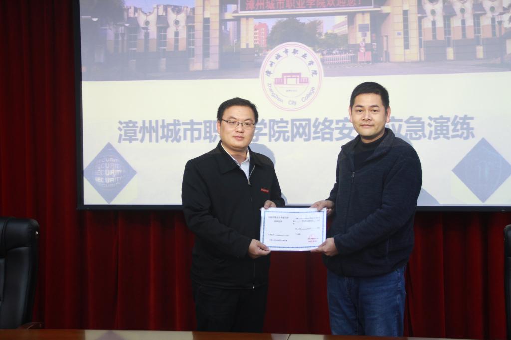 应急演练实际操作环节完成后,林英龙大队长代表漳州市公安局网安支队向学院颁发信息系统安全等级保护备案证书。