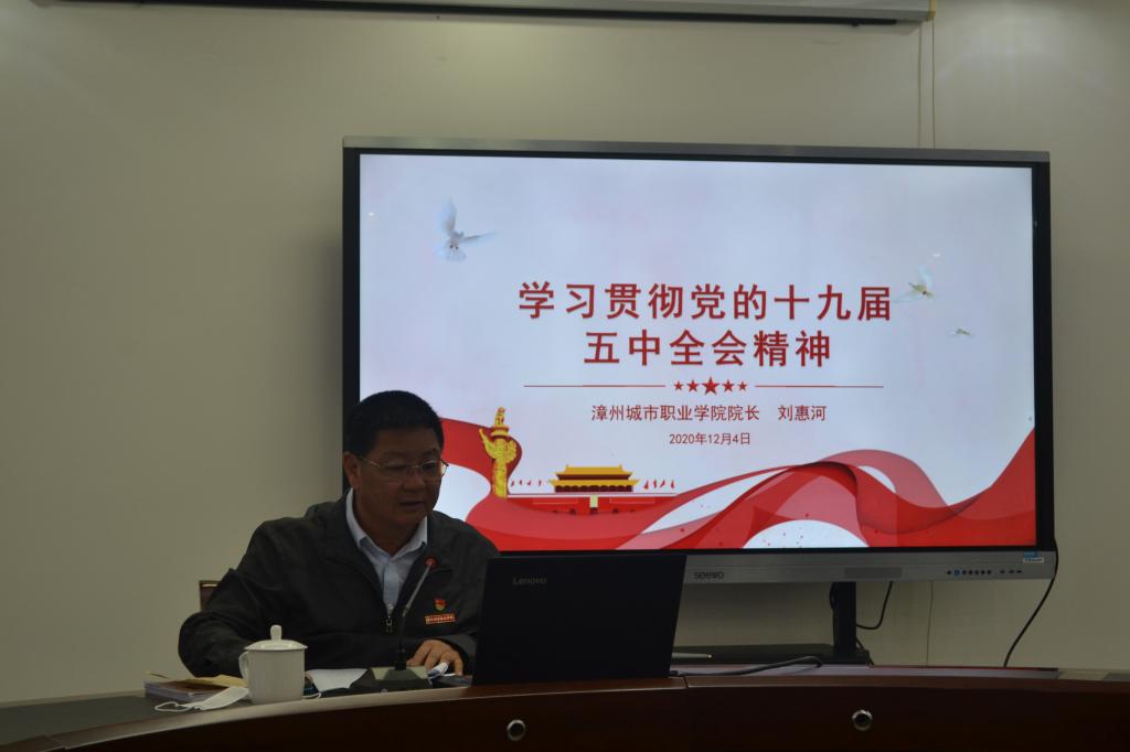 2020年12月4日下午,漳州城市职业学院院长刘惠河到机关第二党支部上党课,宣讲党的十九届五中全会精神,机关第二党支部全体党员及所在人事处、财务处的干部职工聆听了宣讲。刘惠河强调,要认真学习贯彻党的十九届五中全会精神,深刻领会习近平总书记关于规划“十四五”时期发展的重要思想,准确把握新发展阶段、新发展理念、新发展格局的核心要义,全面加强党的领导,深化职业教育改革创新,以更加奋发有为的精神状态,谋划新发展,开启新征程,齐心协力推进新时代漳州城市职业学院高质量发展超越。