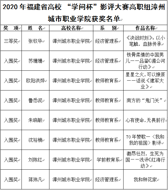 疫情期间,我院图书馆主办,学生工作处协办,郑晨寅、曾丽琴两位教授热心参与指导,积极组织学生,并动员文化创意与策划专业学生、学院百草园文学社、榕坛读书社成员等参加福建省高校数字图书馆联盟(FULink)主办的2020年福建省高校“学问杯”影评大赛。我院共收取影评稿件84篇,根据赛制,由图书馆组织专家组进行初选后,向大赛组委会选送8篇稿件参加终评。经FULink终评委员会对作品进行匿名评审,我院经济管理系张钦华同学的影评《〈决战时刻〉:以小笔触,血脉传承》排名高职组第5名,荣获高职组三等奖,这是漳州市参赛学生中唯一获三等奖以上奖项的选手。苏姗姗等7名同学获得入围奖。同时我院荣获高职组优秀组织奖,孙洁玲老师获得优秀组织个人奖。
