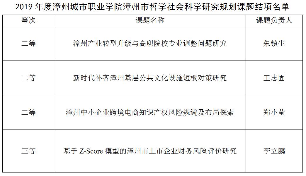 根据漳州市社会科学界联合会发布的《关于2019年度漳州市哲学社会科学研究规划课题结项的通知》(漳社科联〔2019〕12号), 我院四项2019年度漳州市哲学社会科学研究规划课题均获准结项。