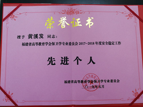 福建省高等教育学会保卫学专业委员会2019年学术年会于5月30日在闽南师范大学召开。会上表彰了2017-2018年度安全稳定工作先进集体和先进个人。漳州城市职业学院被授予“2017-2018年度安全稳定工作先进集体”,是全省被表彰的20所高校(含大学本科和高职高专)之一;黄溪发同志荣获“2017-2018年度安全稳定工作先进个人”荣誉称号。