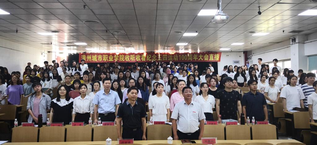 漳州城市职业学院党委高度重视,要求全院各级团组织要通过各种形式,组织团员青年收听收看,认真学习领会习近平总书记的重要讲话精神,弘扬五四精神,砥砺奋进新时代。上午10:30,学院党委书记洪亚勇、院长刘惠河带领我院广大青年师生代表230多人在怀仁楼梯教三集中收听收看纪念五四运动100周年大会的现场直播,学习习近平总书记在大会上的重要讲话精神。