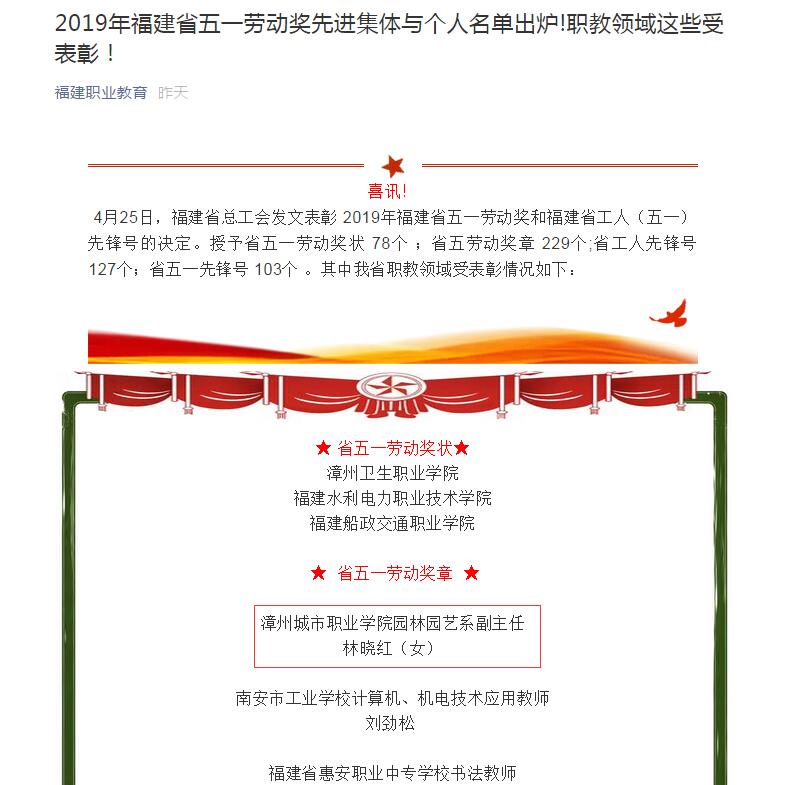 4月25日,福建省总工会公布2019年福建省五一劳动奖章和福建省工人(五一)先锋号名单,我院园林园艺系食品工程系副主任(主持工作)林晓红荣获福建省总工会授予2019年福建省五一劳动奖章。