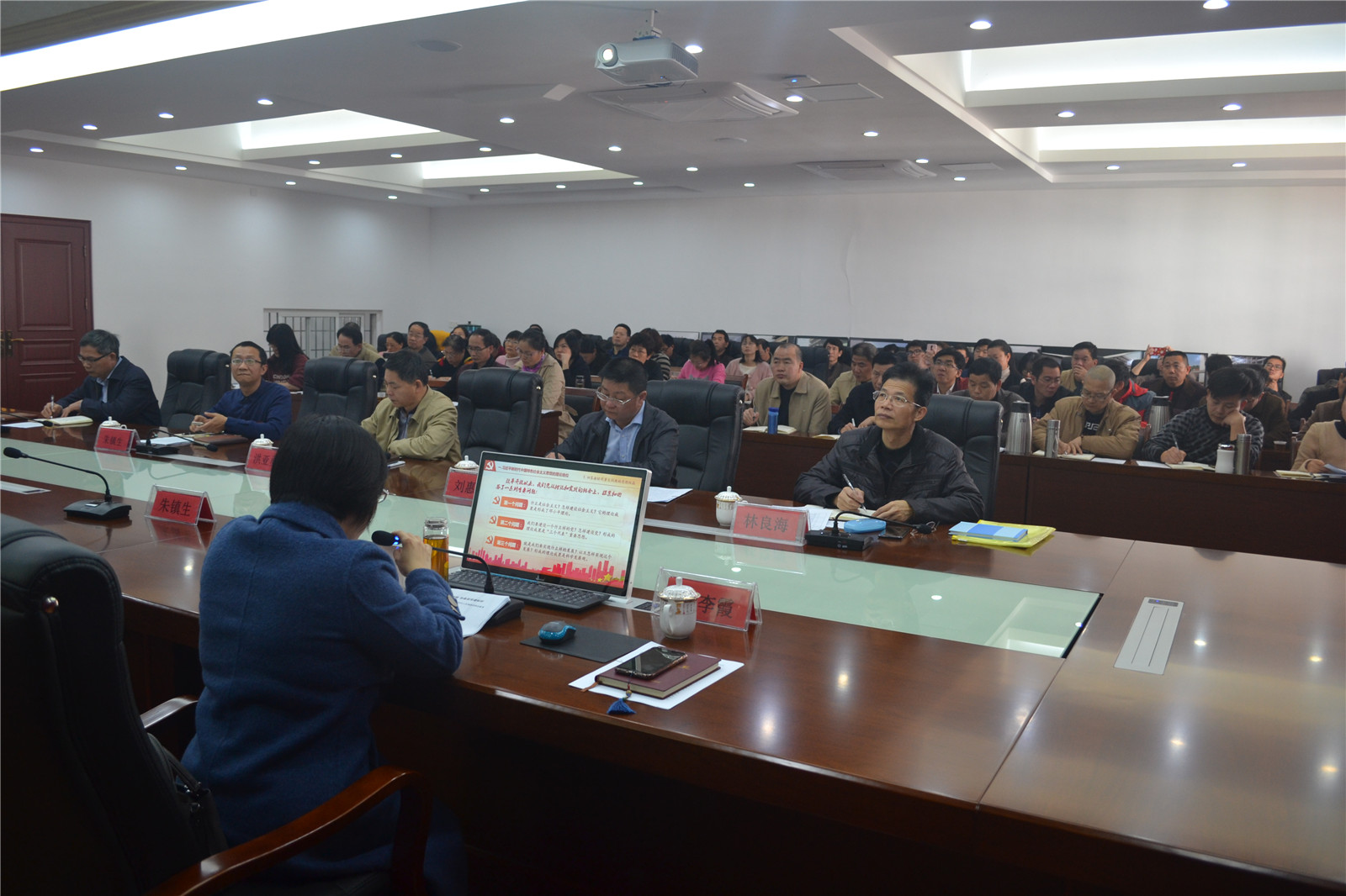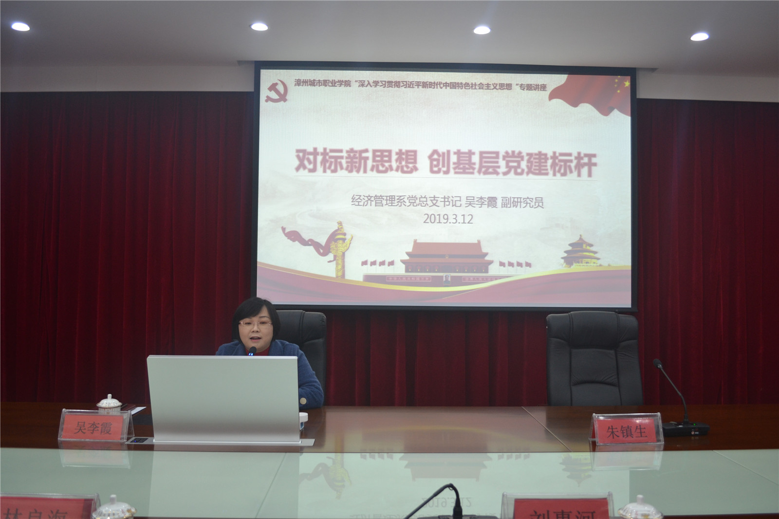 3月12日,漳州城市职业学院召开党委理论学习中心组2019年度第三次学习会议,邀请了经济管理系党总支书记吴李霞副研究员作《对标新思想创基层党建标杆-努力办好新时代人民满意的职业教育》专题辅导报告。学院党委书记洪亚勇、院长刘惠河、副书记朱镇生、副院长林良海,副科级以上干部,台籍教师共70余人参加了学习。会议由朱镇生副书记主持。