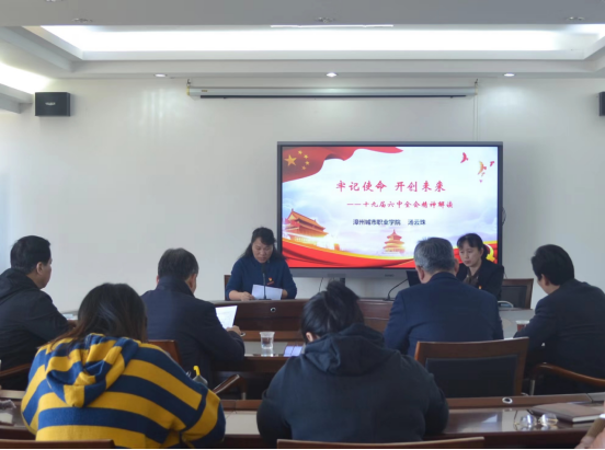 2022年3月9日,漳州城市职业学院机关第一党支部在怀仁楼九楼会议室开展党的十九届六中全会精神宣讲活动。党史学习教育市委宣讲团成员、学院思政部汤云珠副教授为支部全体党员作题为《牢记使命 开创未来——十九届六中全会精神解读》的宣讲。学院党委书记洪亚勇、纪委书记李德胜两位同志以普通党员身份参加宣讲学习。