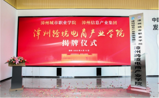 2022年4月12日上午,漳州城市职业学院携手漳州信息产业集团创建的漳州跨境电商产业学院在漳州信产跨境电商公共服务有限公司举行揭牌仪式。漳州城市职业学院党委书记洪亚勇、院长刘惠河出席揭牌仪式,与漳州信产集团有限公司董事长赖小强、总经理吴学恒共同为漳州跨境电商产业学院揭牌,龙文区副区长黄喆煜见证了此次揭牌仪式。揭牌仪式由漳州信产集团有限公司副总经理沈海石主持。