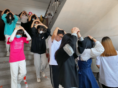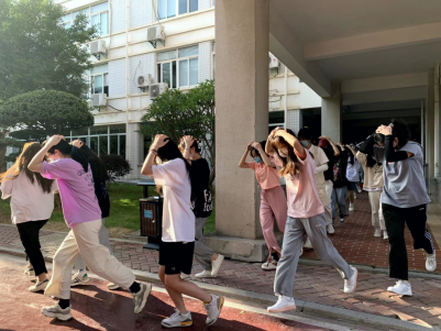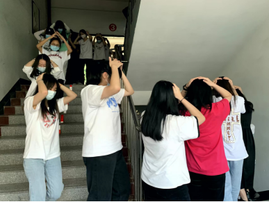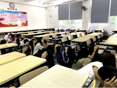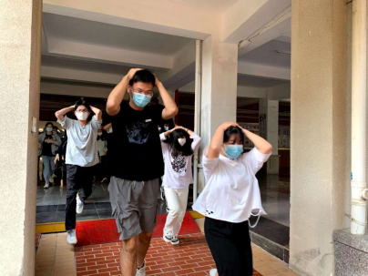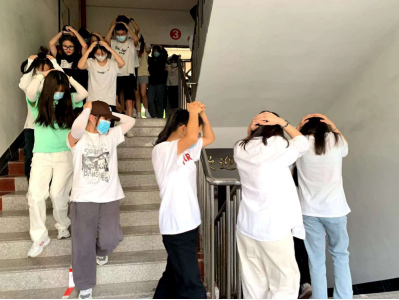 随着“地震警报”信号响起,正在上课的老师和班干部迅速组织学生进行紧急避险,指挥学生用书包或双手保护头部,快速躲到各自的课桌底下,尽量蜷曲身体,降低身体重心;随后,在辅导员、班导师和楼梯转台指挥员的指挥下,学生按照预定的疏散路线,用手护住自己的头部,迅速、有序撤离教室,转移到指定的地点整队。集合后,各班立即清点人数,汇总后向现场指挥朱镇生报告。