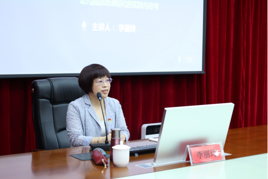 授牌仪式后,李丽玲作了题为《从活游戏到活课程——基于游戏课程化的实践与思考》的讲座。她以一线幼儿园教师在游戏课程改革的实践与困惑为切入点,结合丰富的第一手游戏案例,阐述了幼儿园课程与活动设计中如何以儿童发展为本在游戏中促进孩子的学习与发展,如何在游戏课程化理念的指导下,追随儿童需要生成游戏、生成课程的实践与思考。整场讲座条理清晰、案例翔实,既深入浅出,又充满洞见,让聆听讲座的老师受益匪浅。