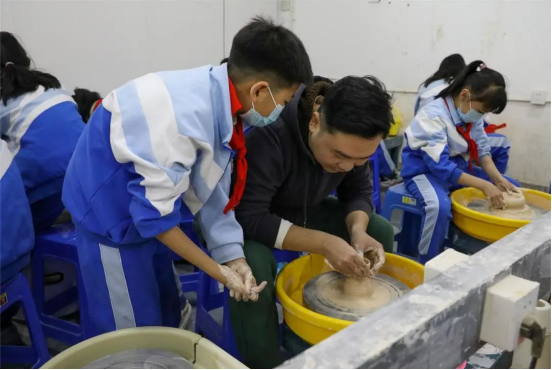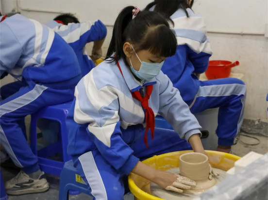 在毛老师的指导下,小学生们亲手体验陶艺拉坯,通过肢体与泥土的触碰,在飞扬的想象力中,切身感受自我与艺术的碰撞。