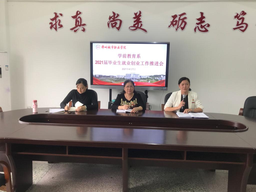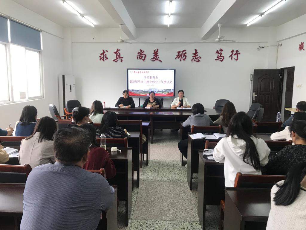 为贯彻党的十九届五中全会精神,进一步做好疫情防控常态化条件下的毕业生就业创业工作,2021年4月7日,学前教育系召开2021届毕业生就业创业工作推进会。学前教育系主任陈慕贞、副书记蔡艺娟、毕业班辅导员、班导师、就业指导老师、就业秘书参加了本次会议,系副书记蔡艺娟主持会议。