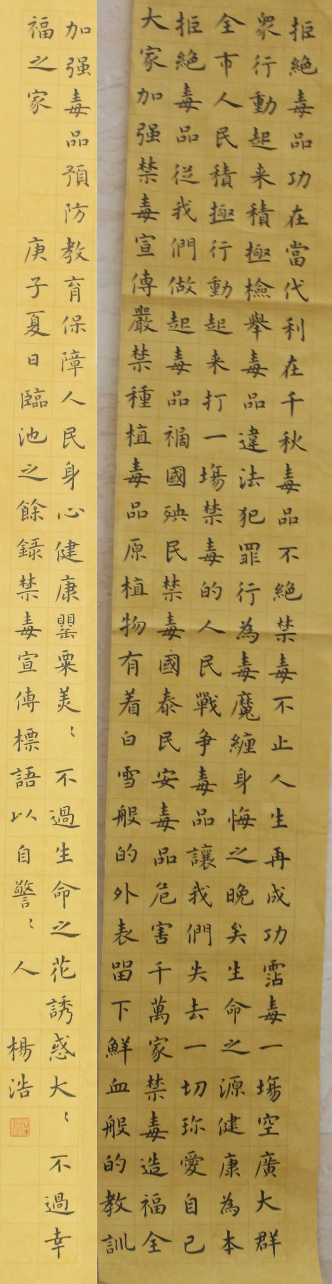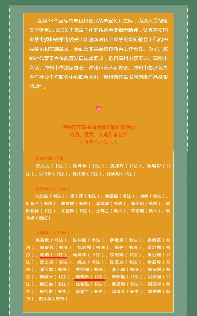 近日,漳州市禁毒办、漳州市文联、漳州市书法家协会、漳州市美术家协会、漳州市鲁冰花青少年社会工作服务中心联合举办“漳州市禁毒书画剪纸作品征集活动”,我院教师教育系罗觉华老师指导的小学教育专业公费师范男生蔡淇乐、杨浩两位学生的书法作品成功入选,喜获佳绩。
