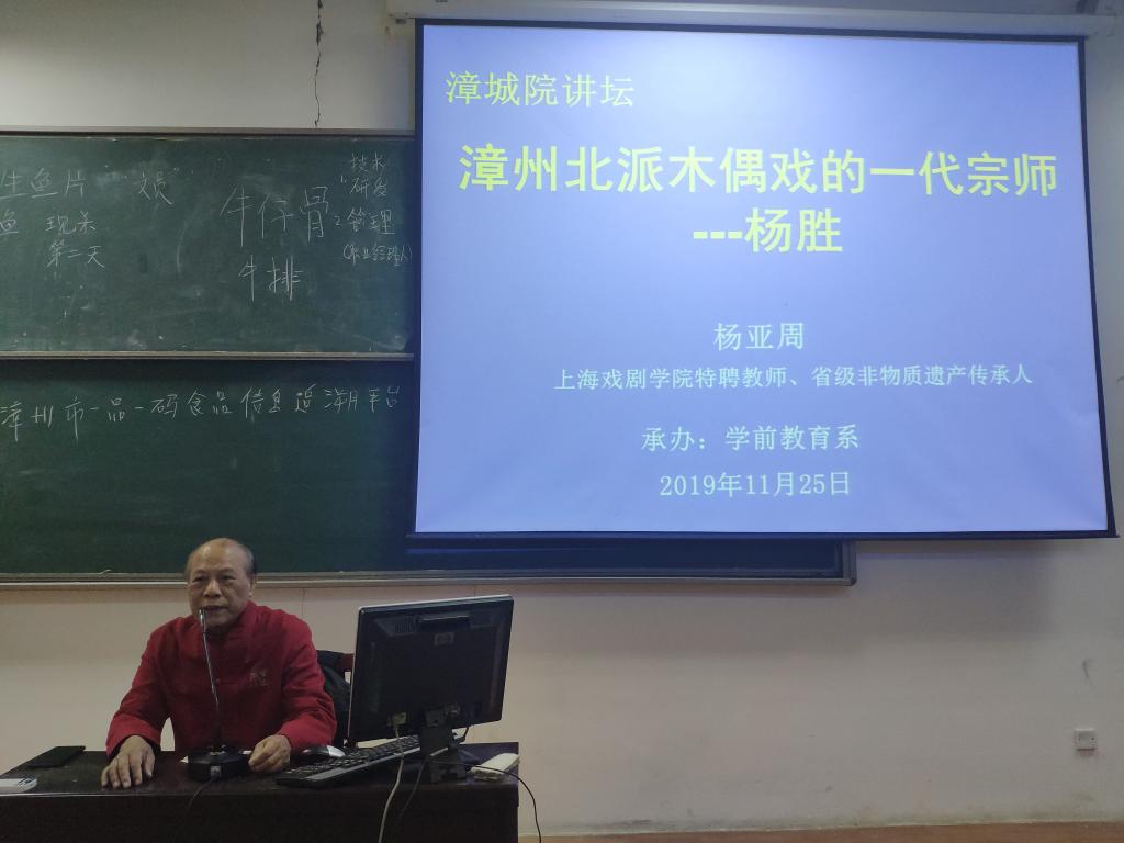 为了让学生对漳州北派木偶戏文化有更多的了解,继承发扬中华优秀传统文化的精神,2019年11月25日晚上,学前教育系在怀仁楼梯教二开展“漳州北派木偶戏的一代宗师——杨胜”为主题的讲座。此次讲座由上海戏剧学院特聘教师、省级非物质遗产传承人杨亚周老师主讲。