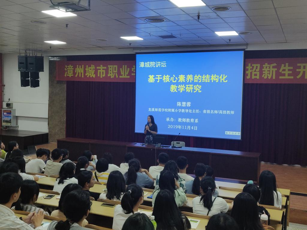 2019年11月4日晚,漳州市教学名师、福建省龙溪师范学校附属小学陈慧蓉老师应邀到我院“漳城院讲坛”作题为《基于核心素养的结构化教学研究》的专题讲座。教师教育系六百多名师生到场聆听了讲座。讲座由教师教育系教学科负责人白碧慧老师主持。
