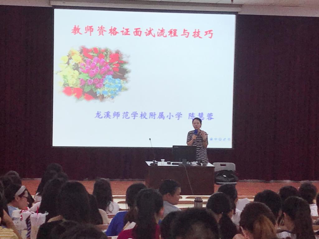 2019年4月10日晚,教师教育系承办的“漳城院讲坛”讲座——“教师资格证面试流程与技巧”在学院梯教六如期举行,讲座由漳州市名师陈慧蓉老师主讲。