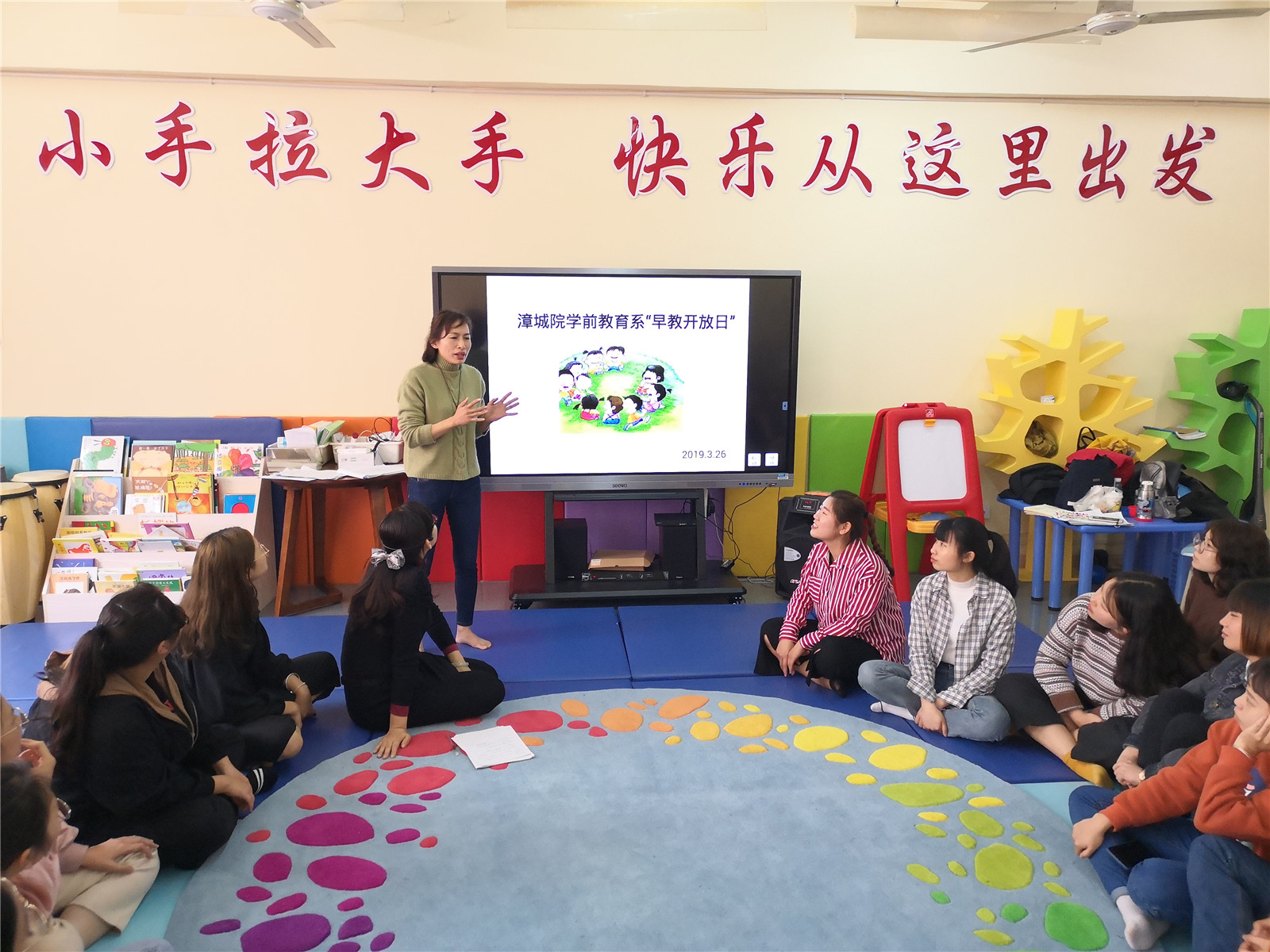 为增强学生服务社会、服务城市的奉献意识,进一步提升早期教育专业学生的专业技能,提高学生理论联系实践的能力,2019年3月26日上午,漳州城市职业学院学前教育系早期教育专业在专业实训室——亲子园活动模拟室组织开展了“早教开放日”活动。此次活动由学前教育系早期教育专业主办,学前教育系团总支协办,早期教育专业带头人、党员教师黄瑾老师主持开展。