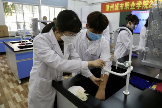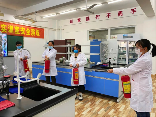 本次演练模拟学生在实训过程中发生酸碱灼伤和实训室初起火灾突发事件时,师生如何开展紧急自救互救、紧急疏散并报告实训室安全负责人等环节。整个演练过程师生反应迅速,疏散有序。