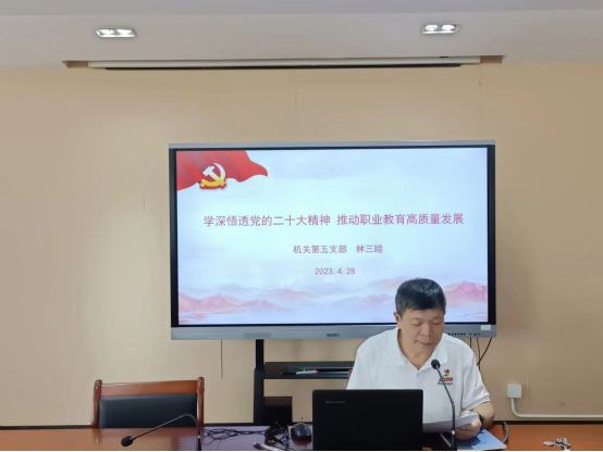 2023年4月28日上午,漳州城市职业学院机关第五支部书记林三睦同志在怀仁楼七楼会议室为支部全体党员上了一堂题为《学深悟透党的二十大精神 推动职业教育高质量发展》的党课。