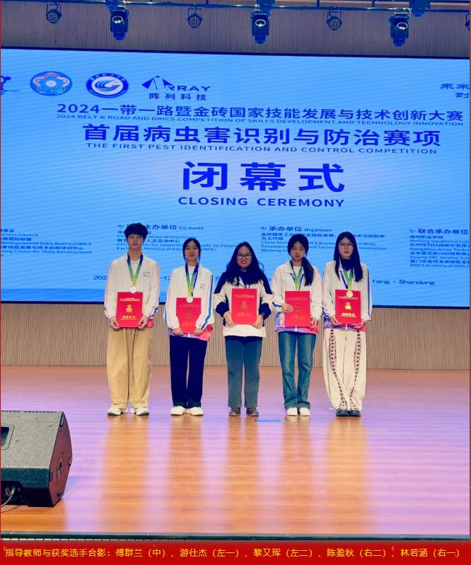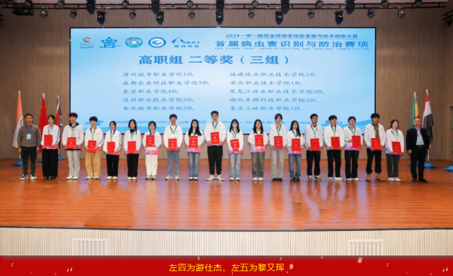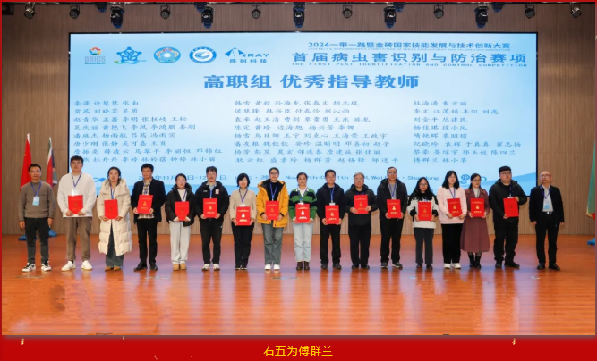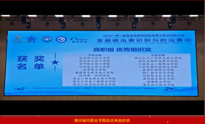 2024年11月29日至12月1日,2024一带一路暨金砖国家技能发展与技术创新大赛首届病虫害识别与防治赛项在山东省潍坊职业学院举行,来自全国 83 所院校的 196 支队伍参加高职组竞赛。漳州城市职业学院生态景观学院师生表现出色,荣获多项荣誉。园艺技术222班游仕杰、花卉生产与花艺232班黎又珲荣获二等奖(指导老师:傅群兰、林小苹),花卉生产与花艺232班陈盈秋、园林技术232班林若涵荣获三等奖(指导老师:林文忠、林小苹);傅群兰、林小苹两位教师被评为优秀指导教师;漳州城市职业学院荣获优秀组织奖。