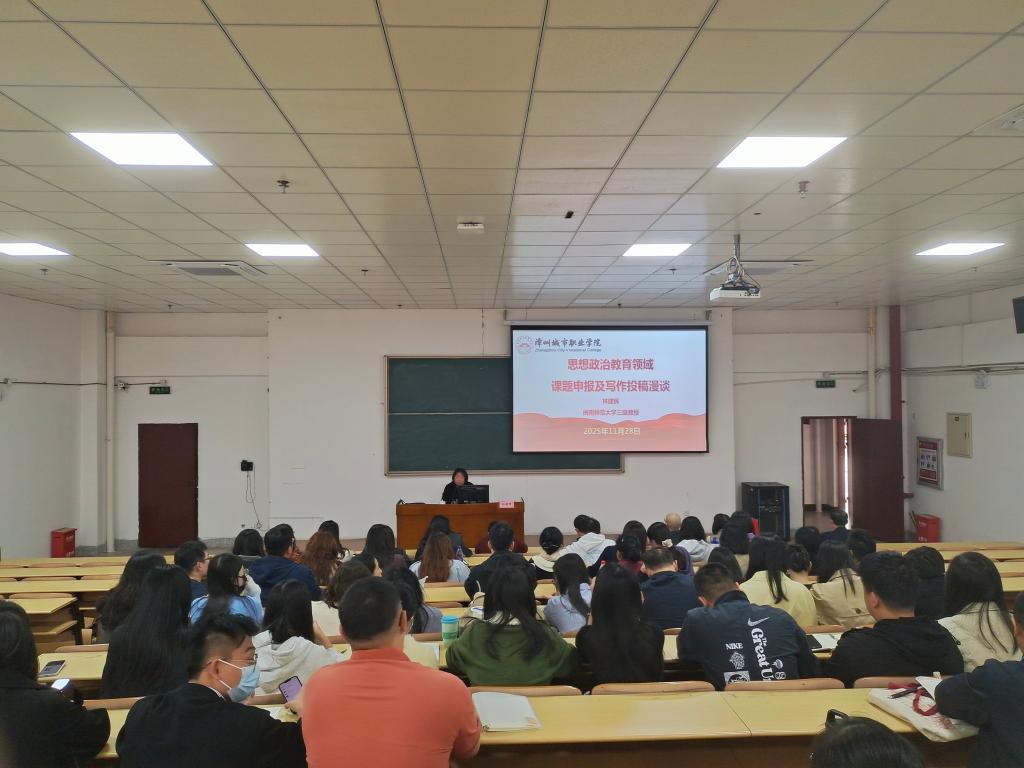 2025年11月28日下午,漳州城市职业学院邀请了闽南师范大学马克思主义学院林建辉教授到校作《思想政治教育领域课题申报及写作投稿漫谈》学术讲座,科研与实训中心主任周晓红主持讲座。