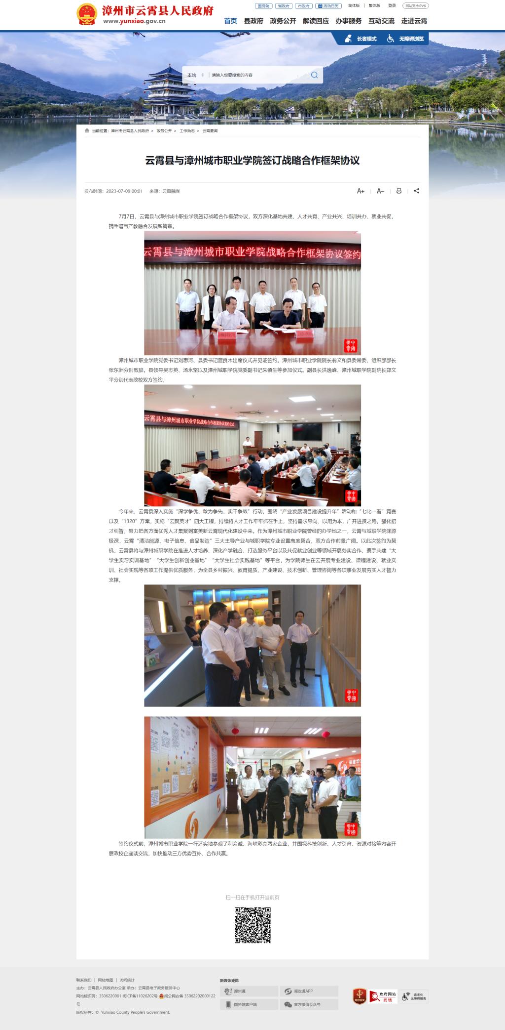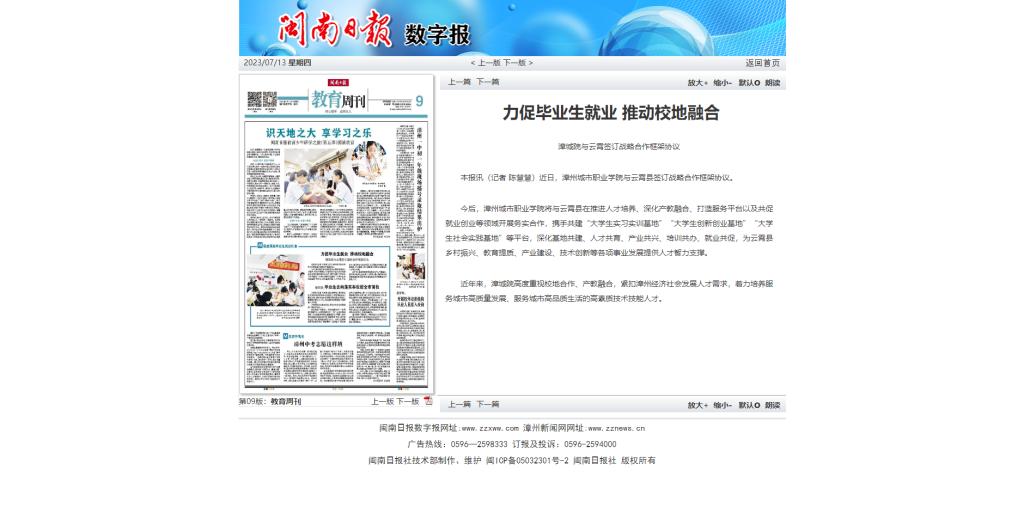 2023年7月9日至7月13日,学习强国、闽南日报、漳州市云霄县人民政府官网报道云霄县与漳州城市职业学院签订战略合作框架协议。具体报道如下: