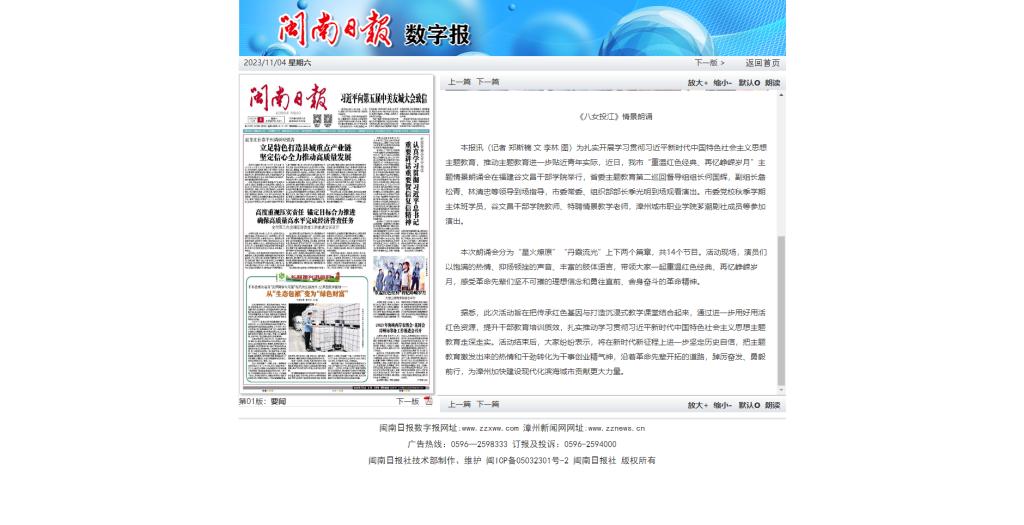 2023年11月4日,学习强国福建学习平台、闽南日报要闻版报道学院与福建谷文昌干部学院、中共漳州市委党校共同举办“不朽的赞歌”主题情景朗诵会。具体情况如下:
