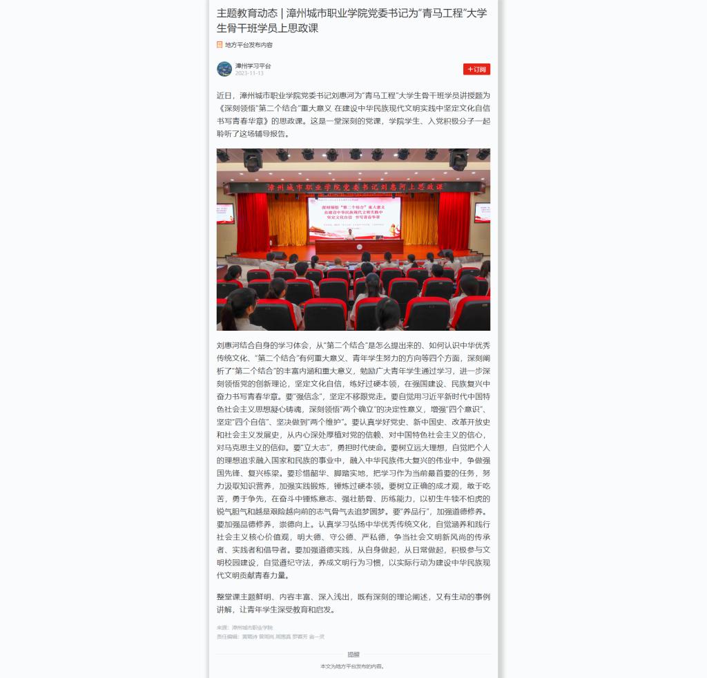 2023年11月13日,学习强国报道学院党委书记为“青马工程”大学生骨干班学员上思政课。具体情况如下:
