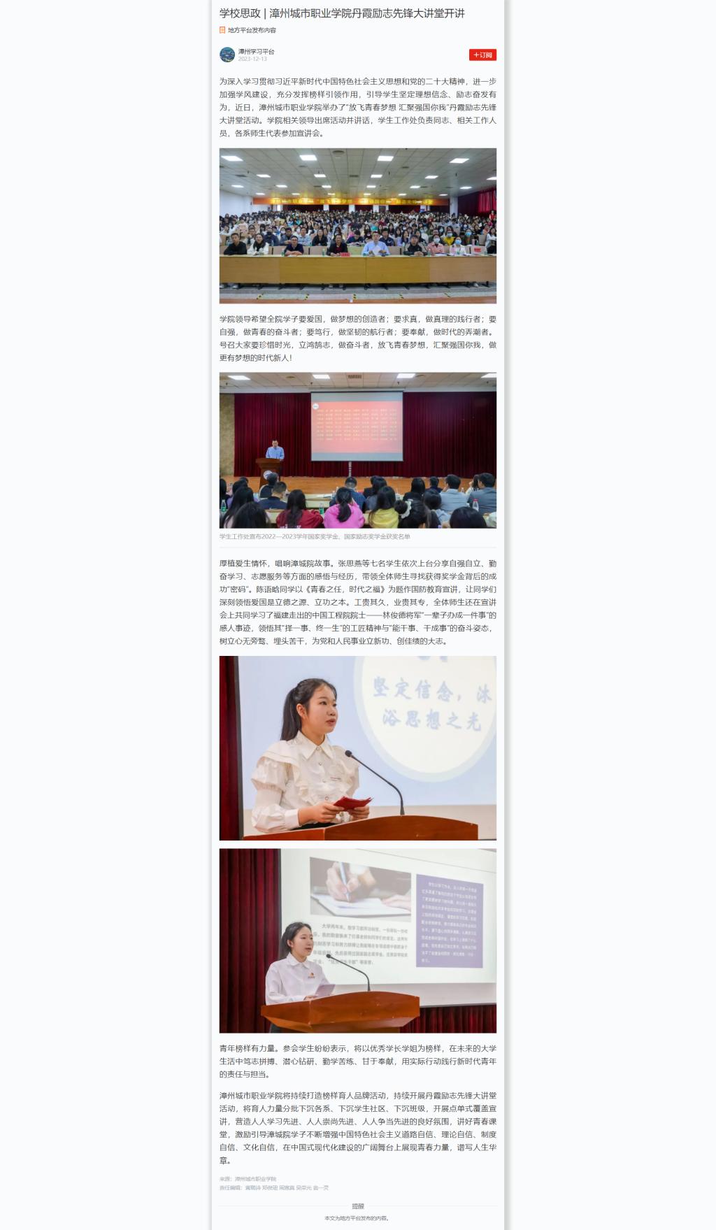 2023年12月13日,学习强国报道学院丹霞励志先锋大讲堂开讲。原文如下:
