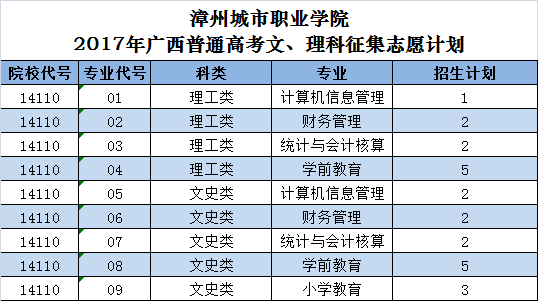 漳州城市职业学院2017年广西壮族自治区常规志愿录取已经结束,我院仍有招生计划未完成,欢迎广西未被录取的考生登录广西2017年普通高校网上志愿填报我院。