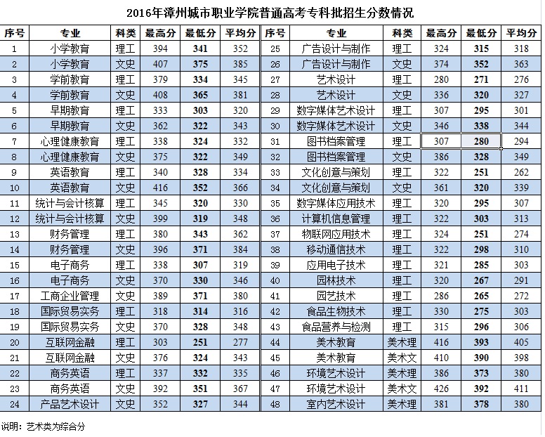 2016年普通高考专科批招生分数情况
