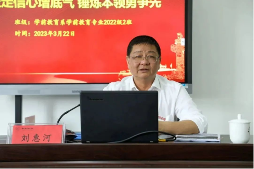 2023年3月22日下午,漳州城市职业学院党委书记刘惠河走进课堂,为学前教育系学前教育专业22级2班学生讲授题为《坚定信心增底气 锤炼本领勇争先》的形势政策思政课。