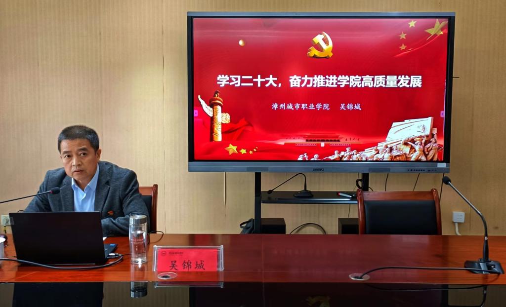 2022年12月5日下午,漳州城市职业学院副院长吴锦城在怀仁楼7楼会议室为所在的机关第五党支部党员和入党积极分子讲授题为“学习二十大 奋力推进学院高质量发展”的专题党课。