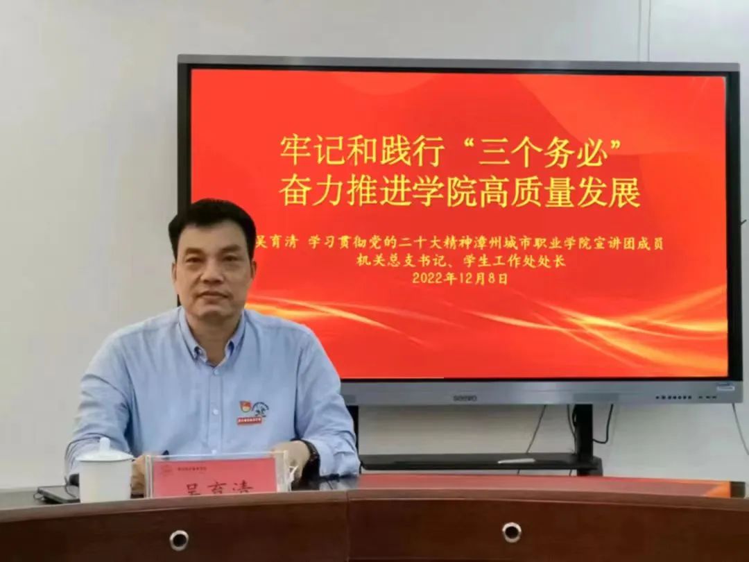 2022年12月8日下午,漳州城市职业学院机关党总支书记、学生工作处处长吴育清为机关党总支委员、机关第三党支部全体党员和入党积极分子讲授题为“牢记和践行‘三个务必’,奋力推进学院高质量发展 ”的党课,宣讲党的二十大精神。