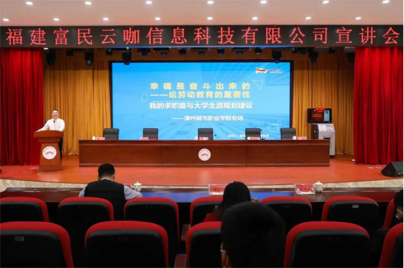 2023年2月21日下午,漳州城市职业学院在丹霞厅举行就业创业经验交流会,邀请福建富民云咖信息科技有限公司总裁郑旺泉作题为《幸福是奋斗出来的--我的求职路与大学生涯规划建议》的经验分享。学生工作处处长吴育清...