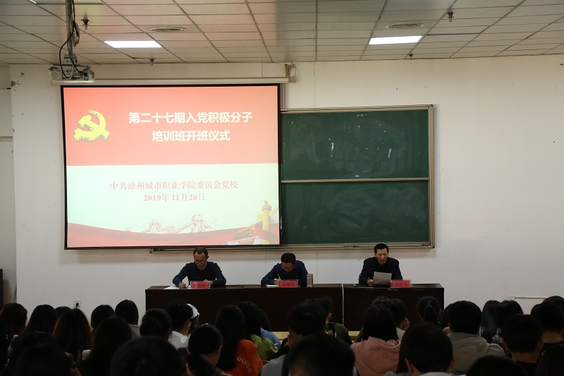 2019年11月20日下午,中共漳州城市职业学院委员会党校第27期入党积极分子培训班开班仪式在怀仁楼梯教3举行。学院党委副书记朱镇生,党校常务副校长、思想政治理论课教研部主任黄跃文,党校办公室负责人以及161名...