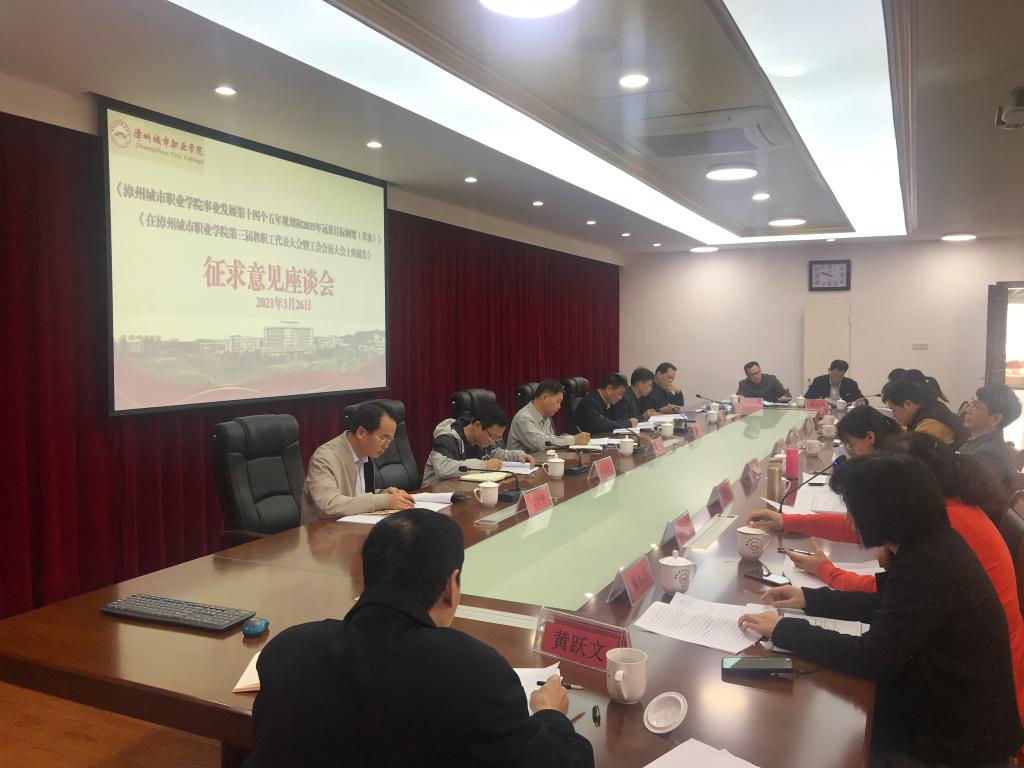 凝聚智慧 共谋发展漳州城市职业学院召开征求意见座谈会 2021年3月26日上午,漳州城市职业学院党委在怀仁楼四楼会议室召开以“凝聚智慧、共谋发展”为主题的征求意见座谈会。党委书记洪亚勇、院长刘惠河等班子成...