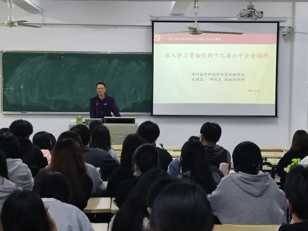 2021年12月13日,漳州城市职业学院党委副书记朱镇生以《深入学习贯彻党的十九届六中全会精神》为题,在博学楼106为金融211和商英211班的学生上思政课——作学习贯彻党的十九届六中全会精神辅导报告。 朱镇生从“...