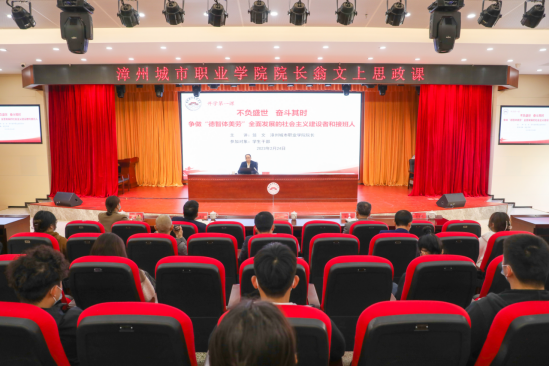 2023年2月24日上午,漳州城市职业学院院长翁文在丹霞厅为学生干部讲授题为《不负盛世 奋斗其时 争做“德智体美劳”全面发展的社会主义建设者和接班人》的思政课。翁文结合自身的学习体会和思考,围绕“全面学习...